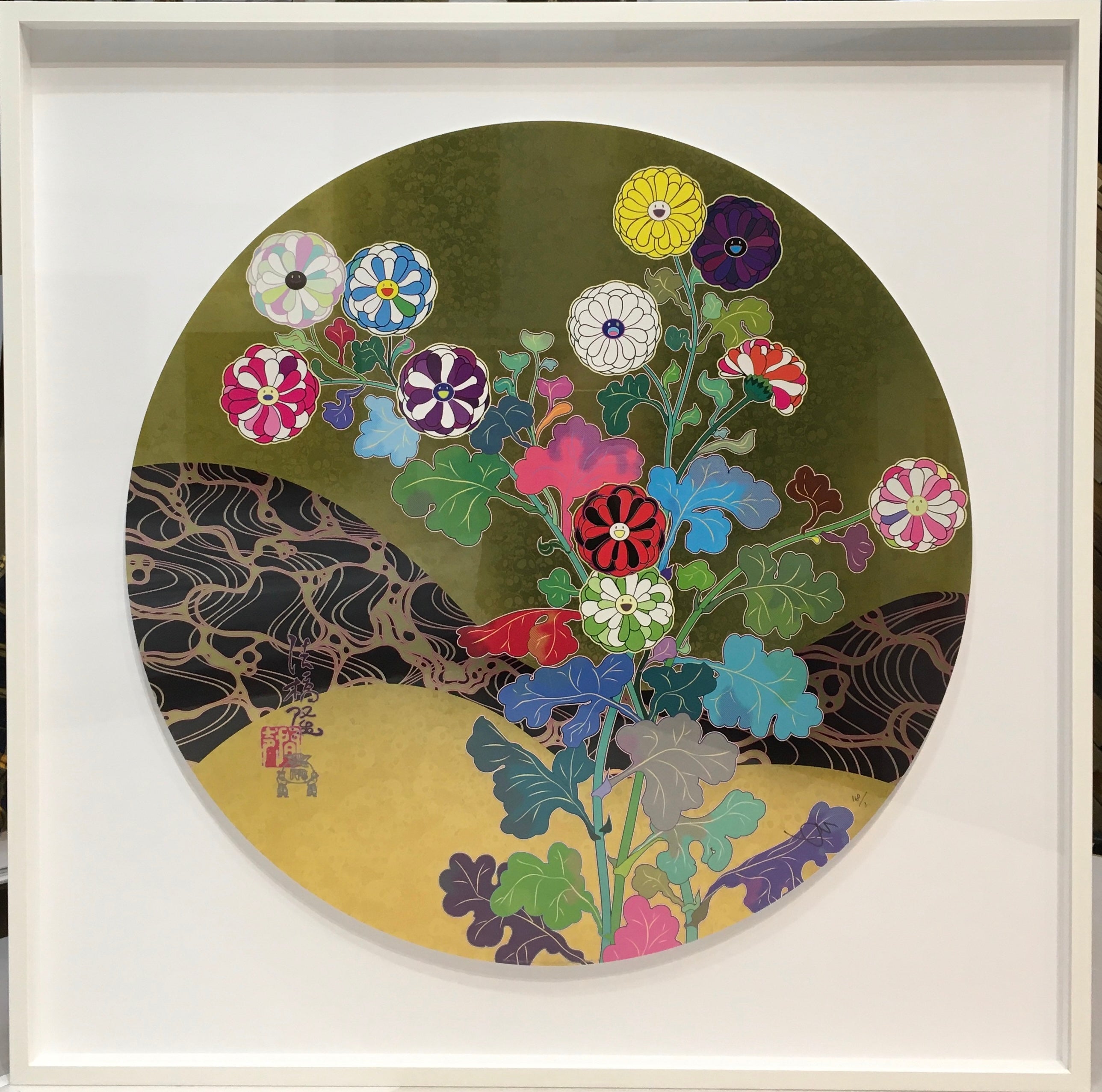 Takashi Murakami is a world famous artist who has firmly established himself in the international art scene with his spectacular and distinctively Japanese aesthetic. As one of the founding members of the “Superflat” movement which placed him within the legacy of Pop art, he creates art with an exceptionally original artistic language inspired by his homeland’s anime, manga culture and informed by Japan’s centuries old artistic lineage, Buddhism, and historical Japanese art. In true pop-art style, he blurs the boundaries between fine art and mass culture, integrating marketing and consumerism into his artistic concept. In doing so, he traverses the spheres of art, design, and pop culture, as shown by his collaboration with Louis Vuitton. His work is exhibited and collected by many important museums and collected worldwide.